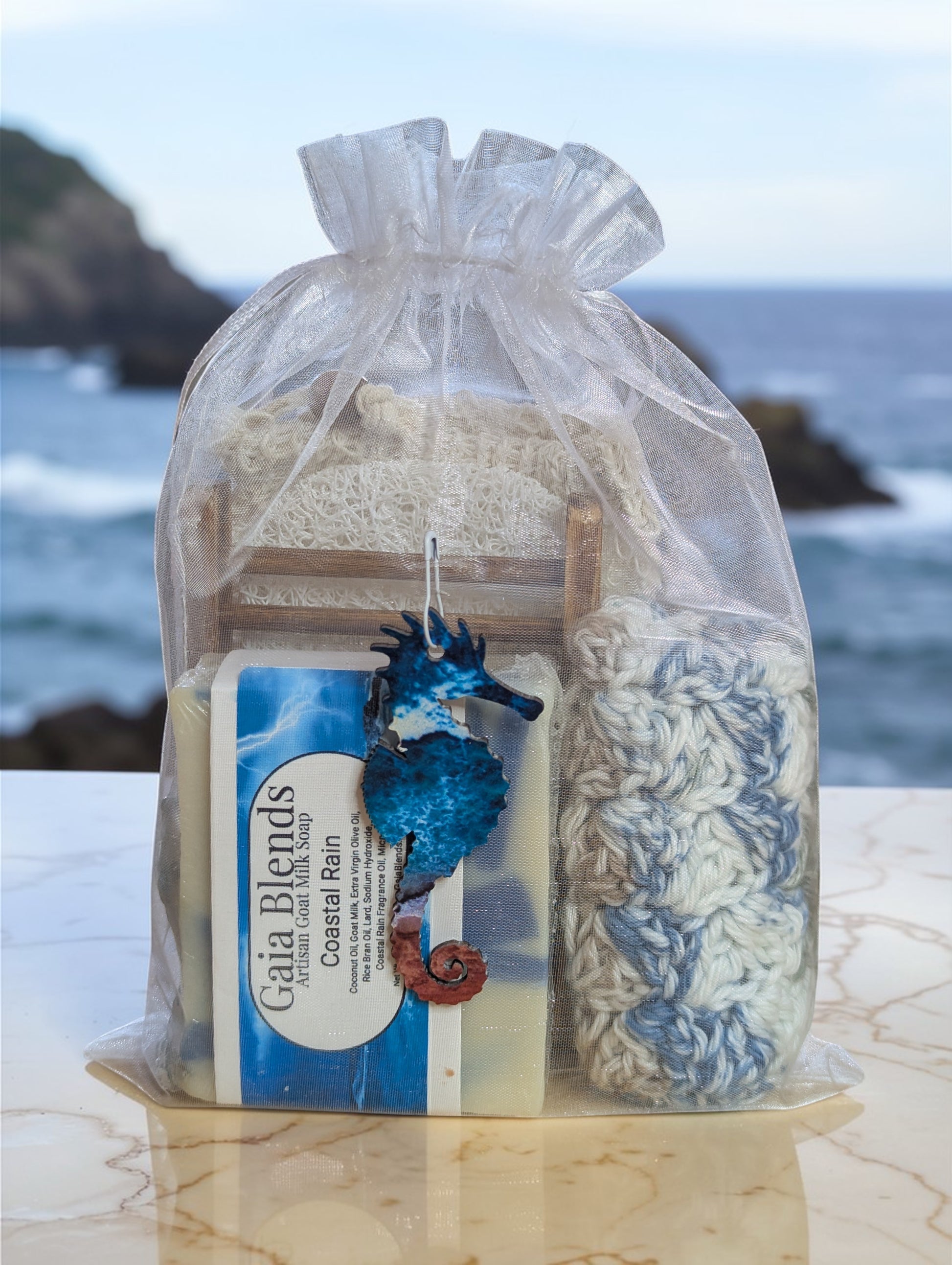 Coastal Rain Soap Ingredients: Coconut Oil, Water, Extra Virgin Olive Oil, Rice Bran Oil, Lard, Goat Milk, Sodium Hydroxide, Coastal Rain Fragrance Oil - 6 oz.