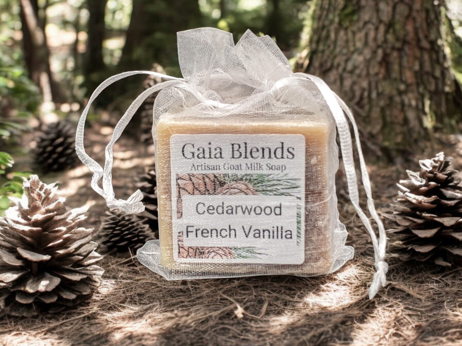 Ingredients: Coconut Oil, Water, Extra Virgin Olive Oil, Rice Bran Oil, Lard, Goat Milk, Sodium Hydroxide, Himalayan Cedarwood Essential Oil, French Vanilla Fragrance Oil