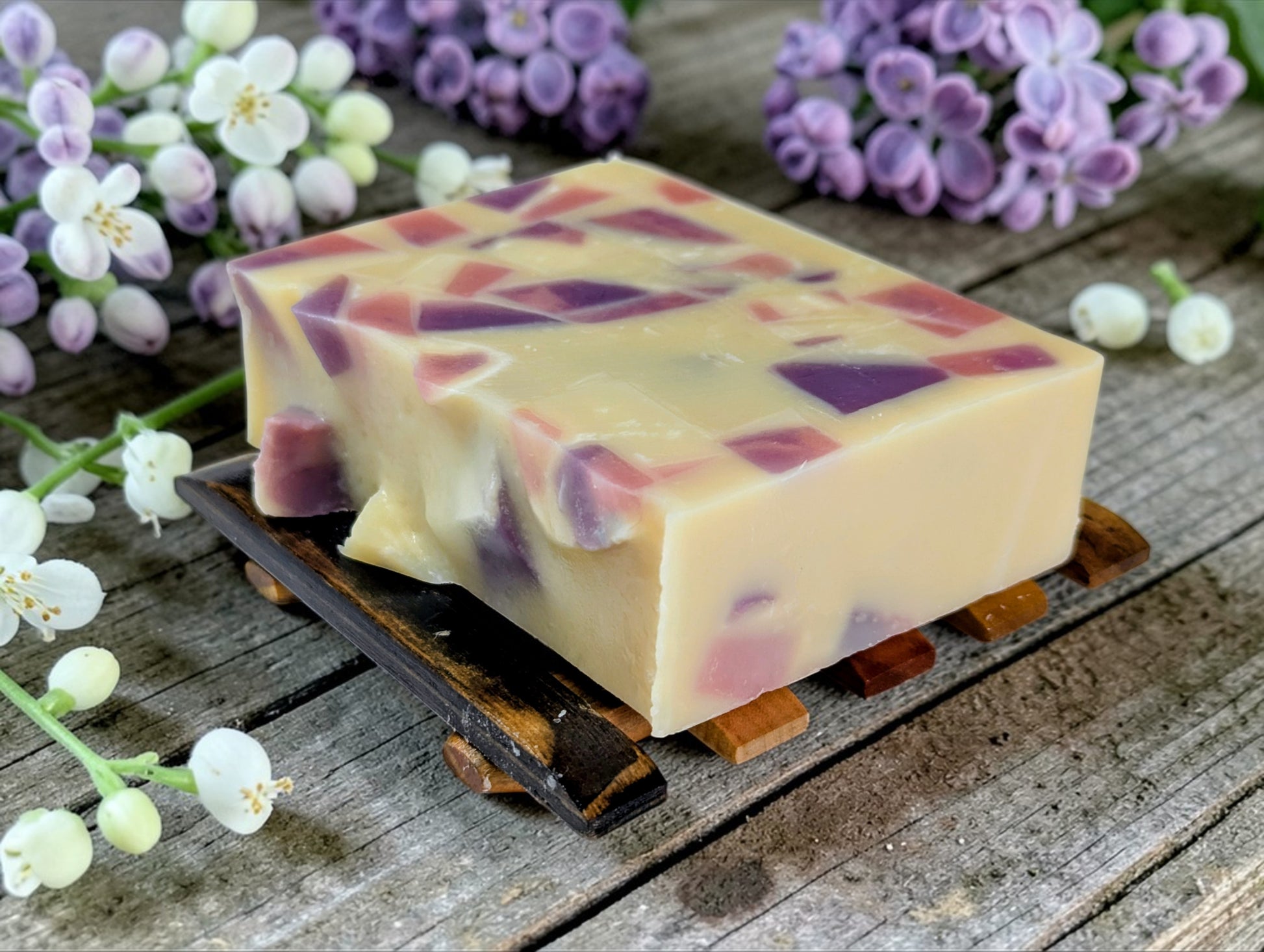 Ingredients: Coconut Oil, Goat Milk, Extra Virgin Olive Oil, Rice Bran Oil, Lard, Sodium Hydroxide (Lye), Jasmine Fragrance Oil, Lilac Fragrance Oil, Mica