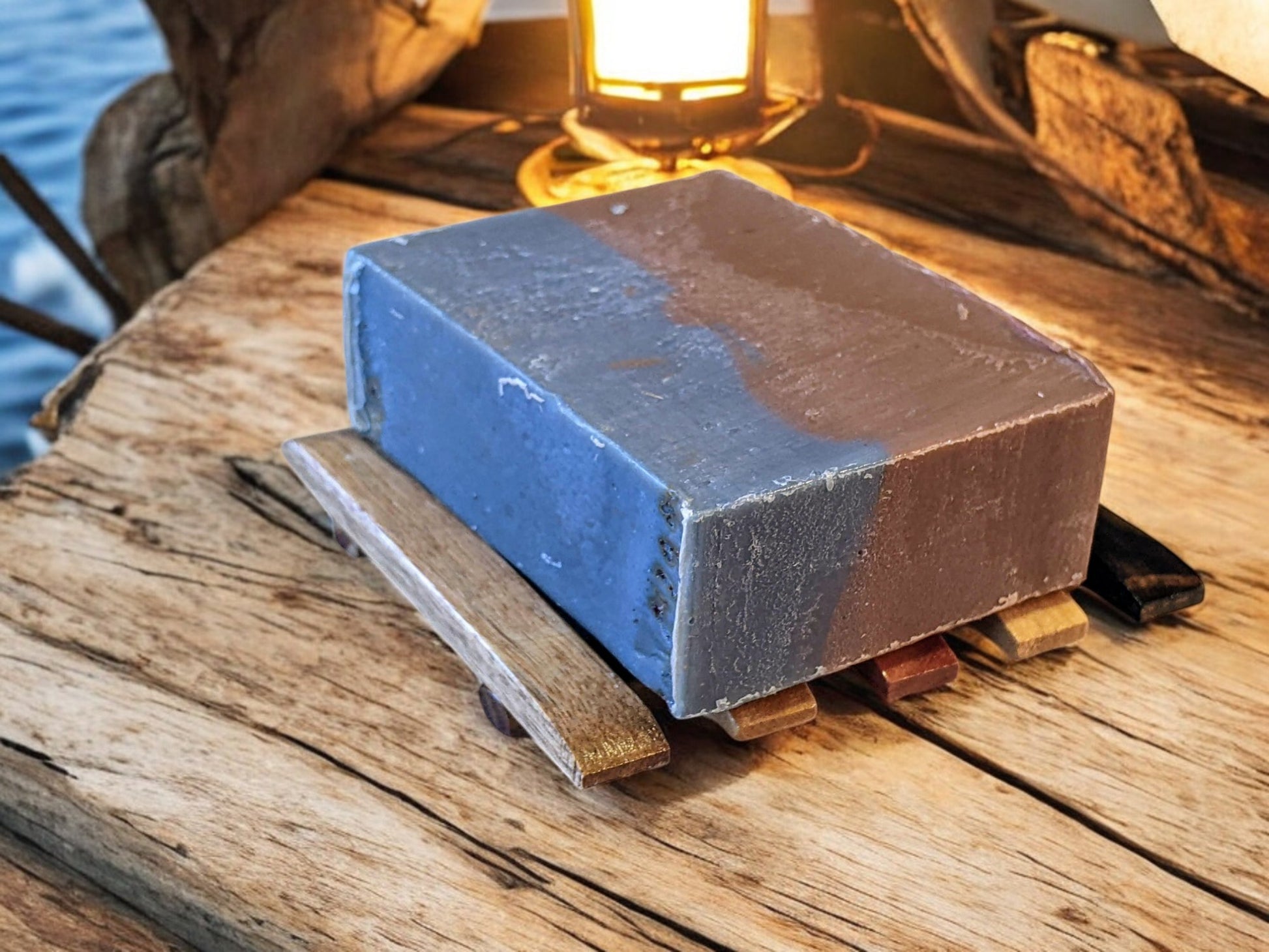 Soap ingredients: Coconut Oil, Water, Extra Virgin Olive Oil, Rice Bran Oil, Lard, Goat Milk, Sodium Hydroxide, Hickory & Suede Oil, Mica & Pigment - 6 oz.